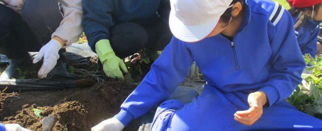 幼稚部のお友達と畑に種芋を植えました。 ジャガイモの植え付け(小)…
