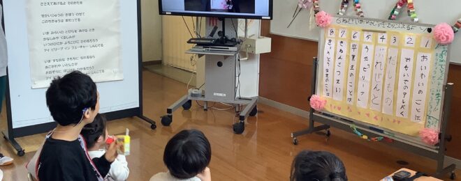 プレゼント贈呈や学部紹介動画の放映がありました。 入学おめでとう集会(小)…